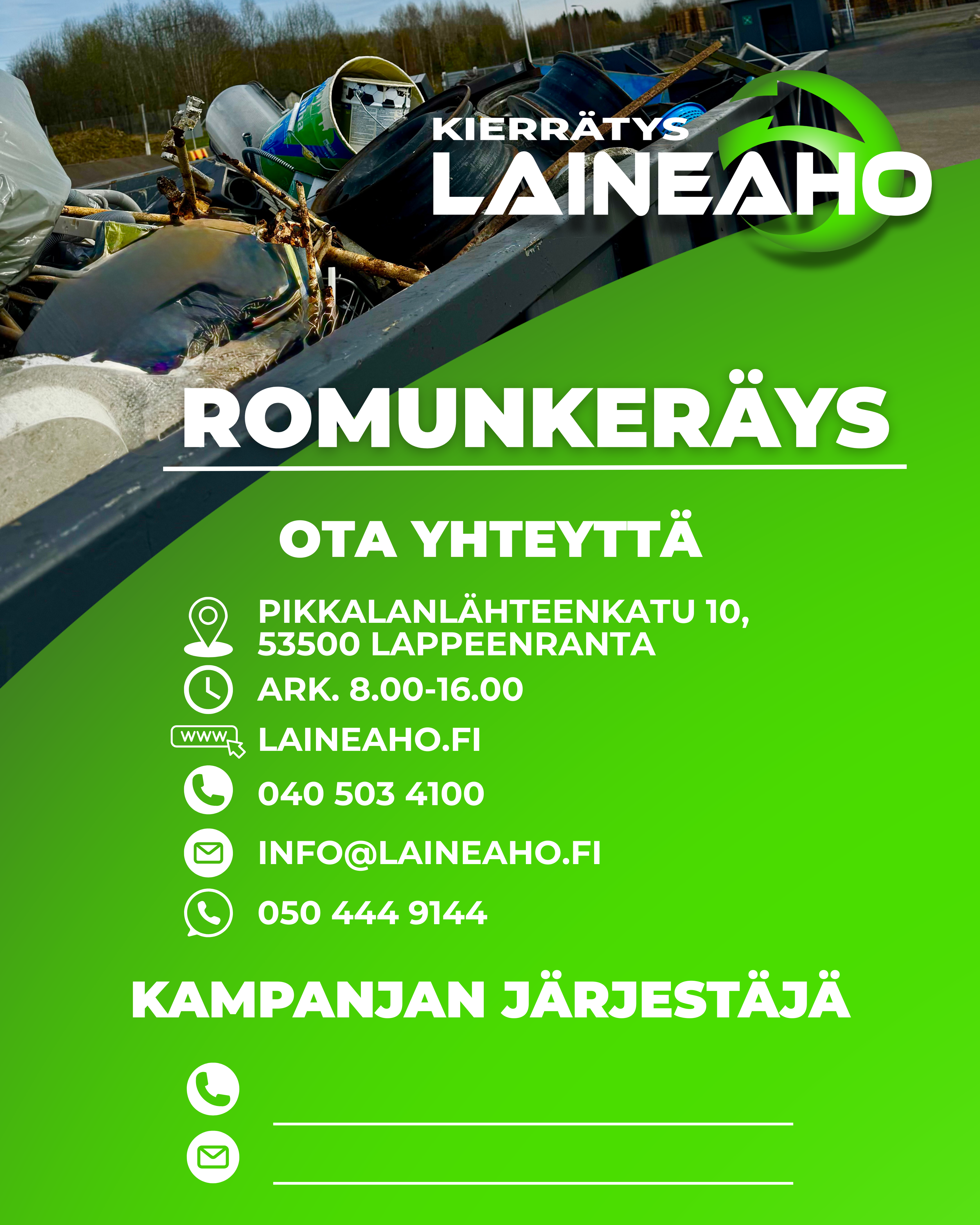 Keräyskampanjan sijainnista riippuen romut voi kerätä myös kasalle sovittuun luvalliseen paikkaan. Kampanjan päättyessä noudamme romut romunkeräysautollamme.